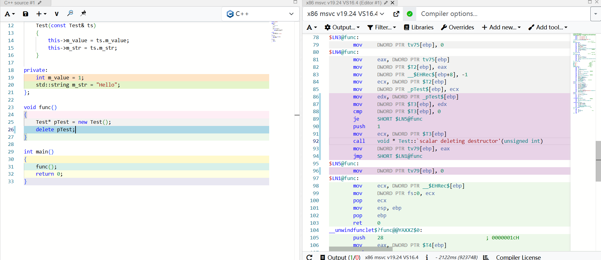- 析构调用:即使汇编代码未显式调用,delete操作符最终会触发对象的析构函数